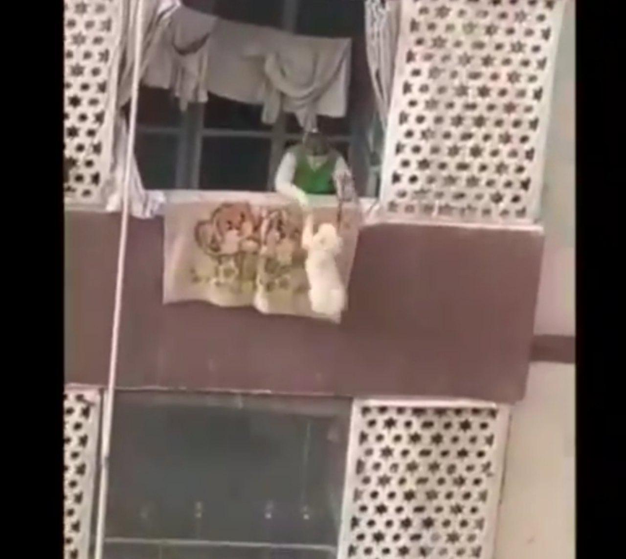 خانمی در یکی از ساختمان های اتوبان شهید بابایی اقدام به آویزان نمودن و کتک زدن سگ خود میکرد.