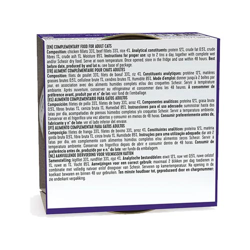 کنسرو گربه شسیر طعم مرغ و گوشت گوساله و برنج آب پز شده 85 گرم